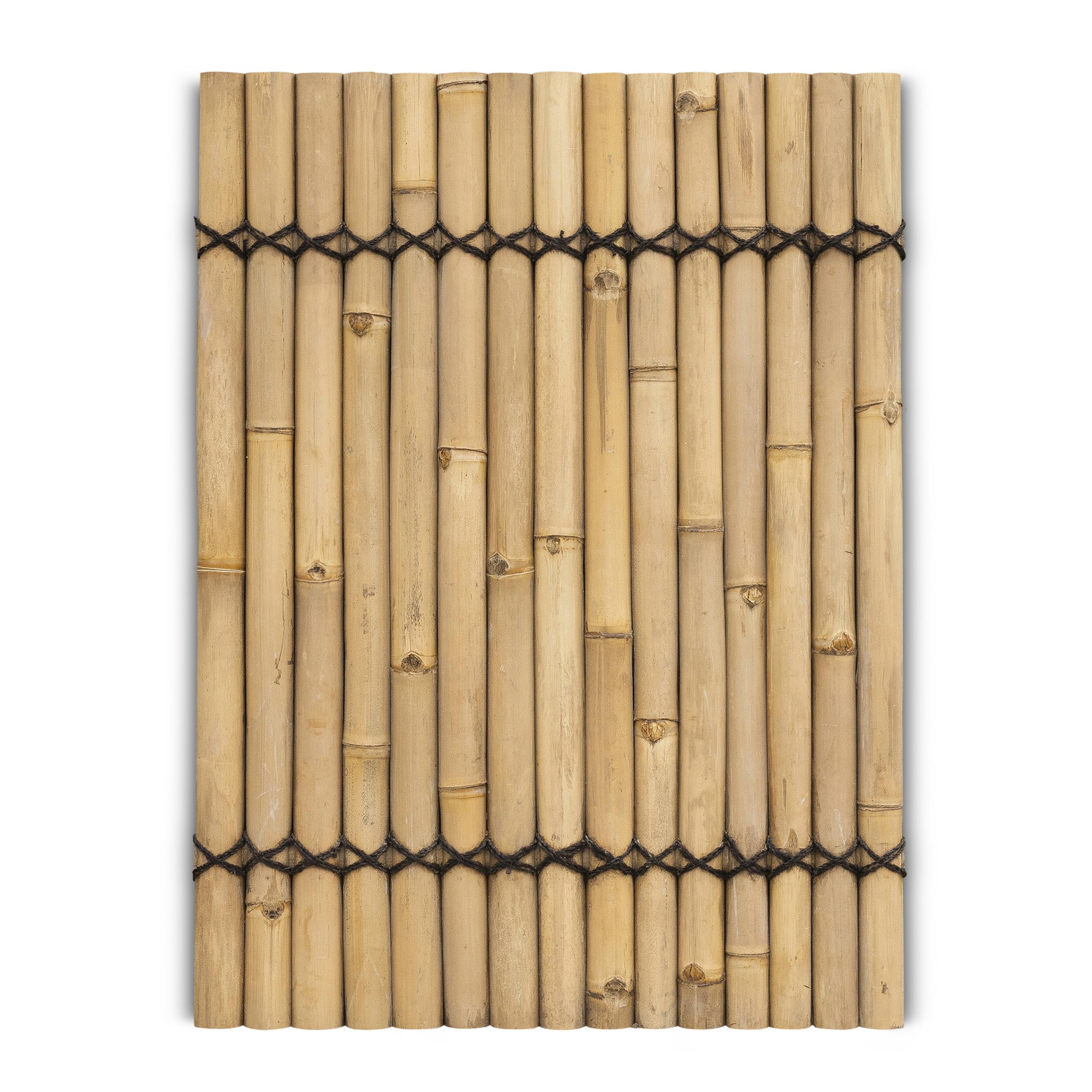 Bamboo fence semi-circular 90 x 120 cm made of halved bamboo poles. This screen has a natural color. In no time a vacation feeling in your own backyard, who wouldn't want that? The poles have a diameter of 5-8 cm and are mounted together via horizontal bamboo canes.