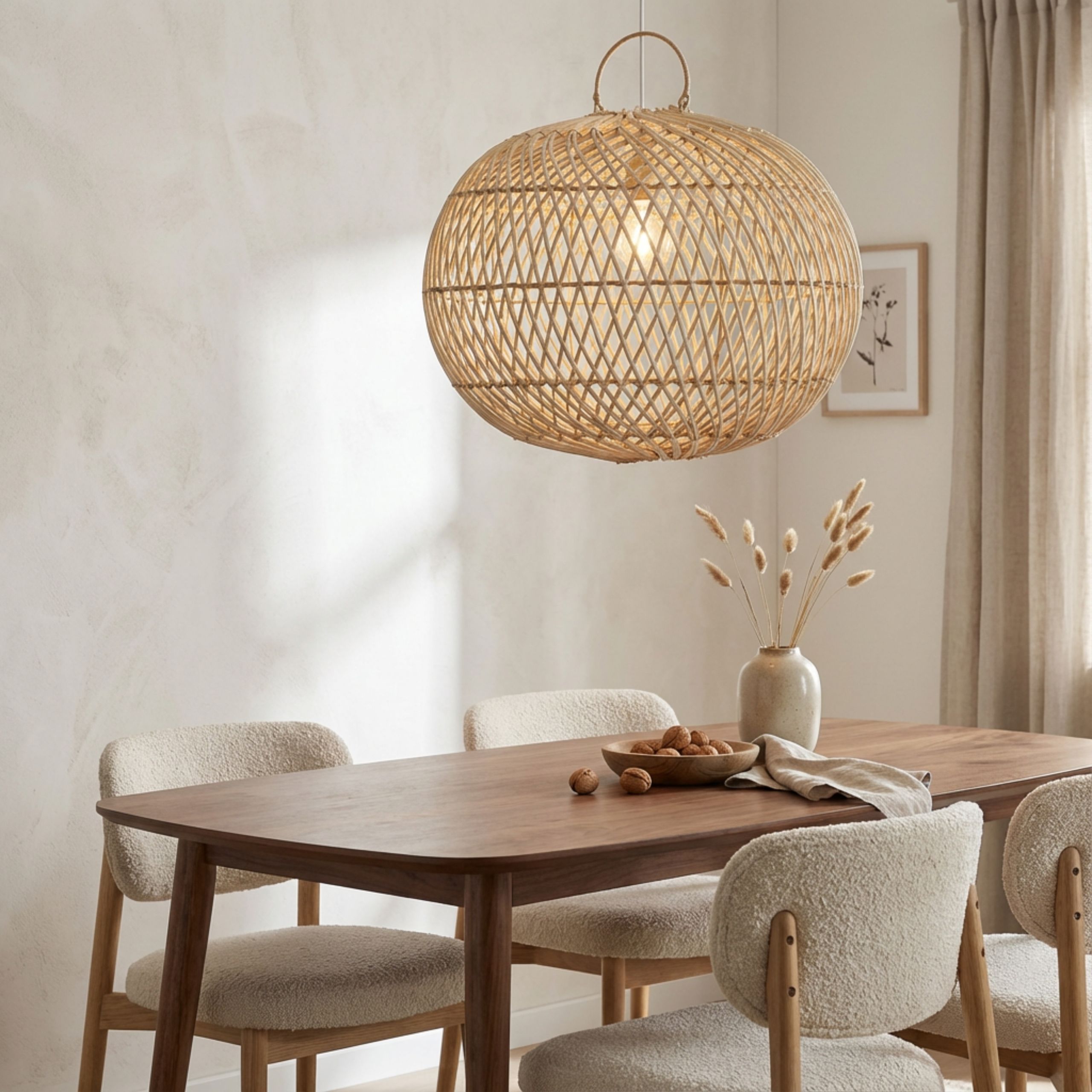 The 40 cm wide Kaya pendant lamp in natural rattan has a quiet, natural look and fits effortlessly into smaller rooms or in places where you want subtle lighting. Think bedroom, hallway, above a small table or in a cozy reading nook.