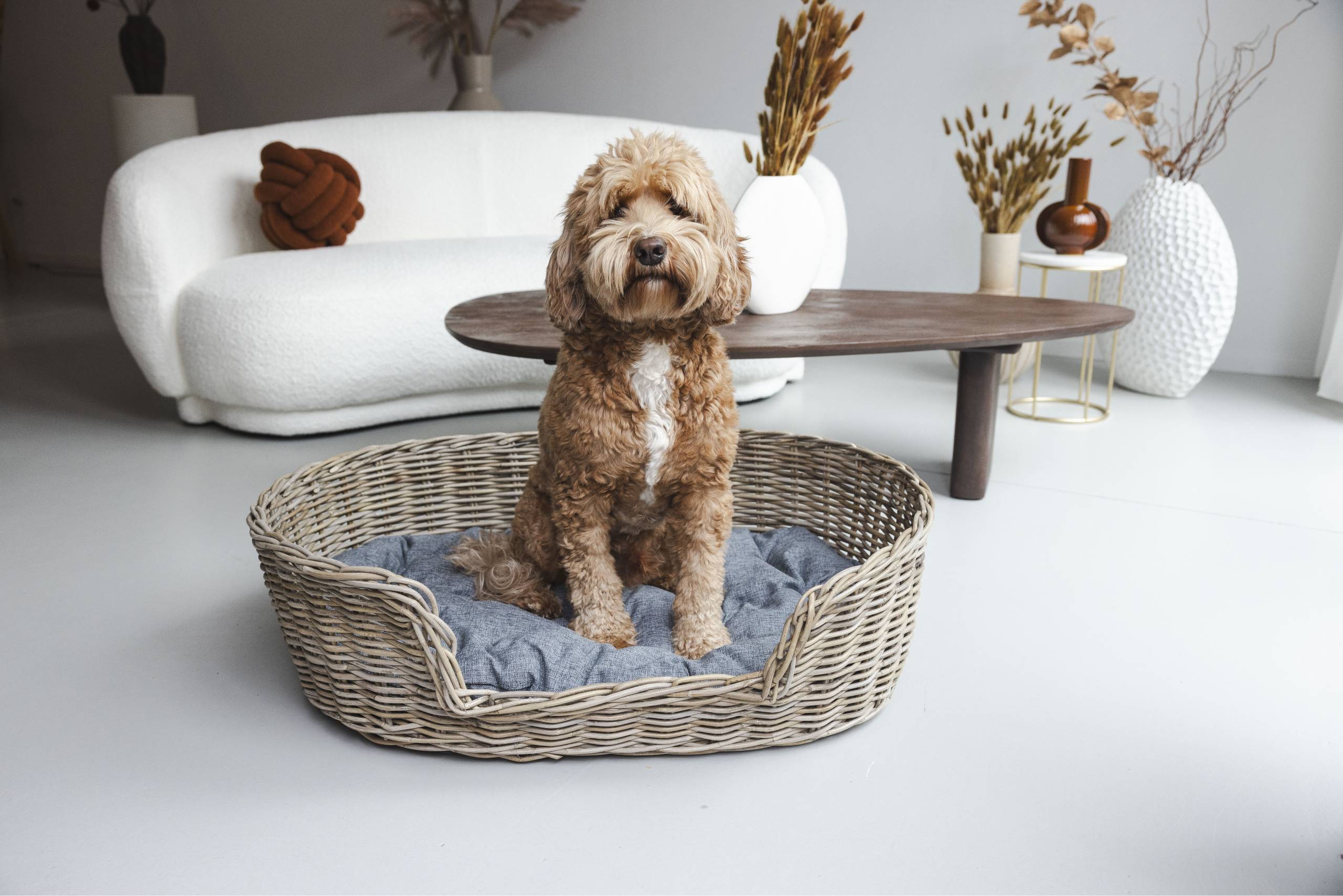 This Rattan Dog Basket Oval 70 cm by PVB Collection is hand-woven from natural rattan, making each basket slightly different and unique. Thanks to its calm, natural look, it looks great in almost any interior. The basket comes with a separate dark gray cushion to dream away in. Please note that the cushion is not washable. Suitable for small dogs, such as a Jack Russell.