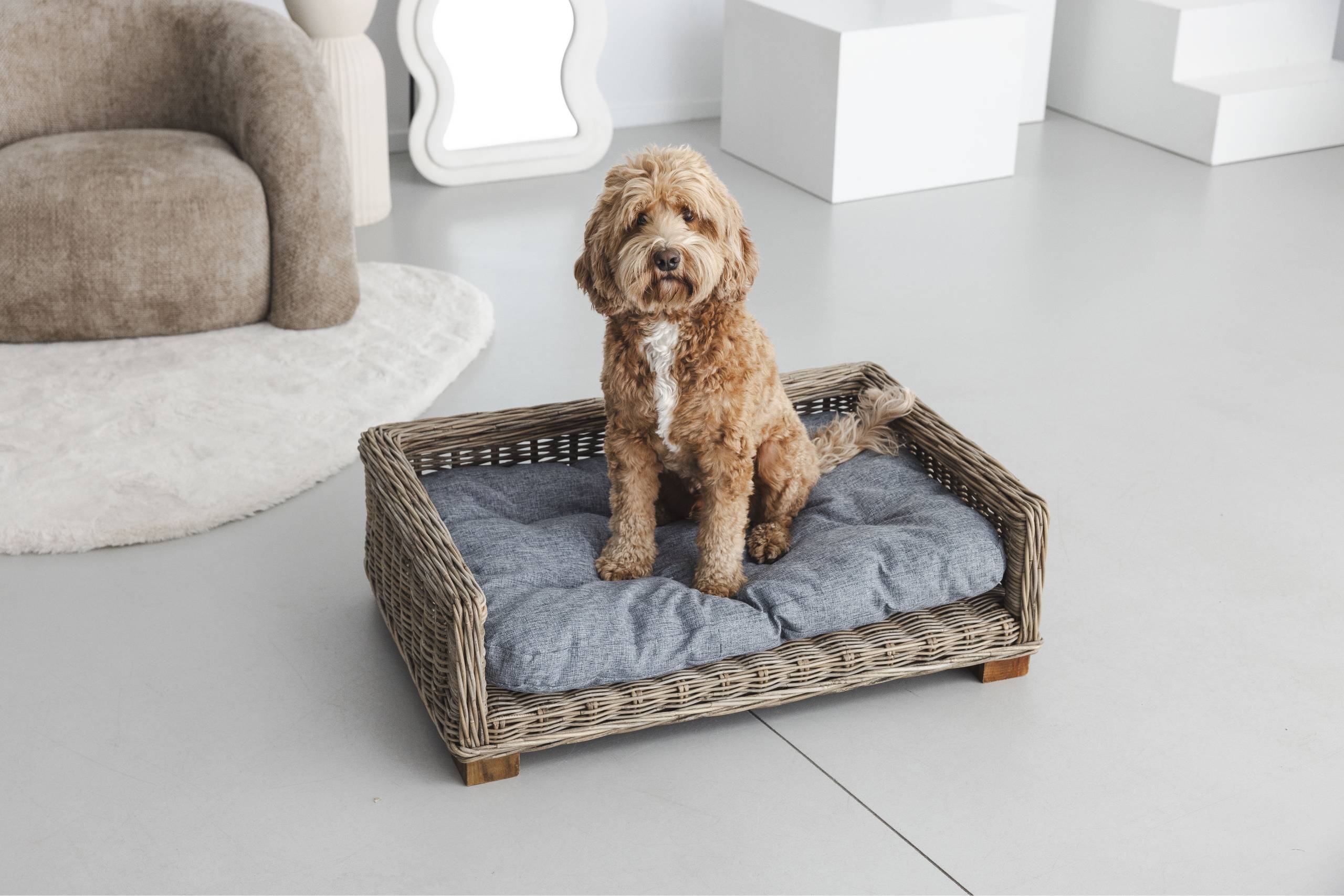 The dimensions listed are guidelines. Because this rotan dog basket is handcrafted from natural material, dimensions may vary slightly.